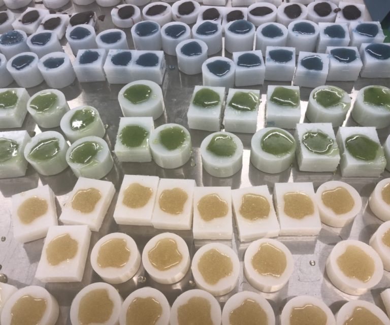 水石という石を台座にのせて鑑賞する文化があります。石は古くから鑑賞の対象になっていましたが、水に濡らすと美しいというところから水石という文化が生まれたという話もあります。水に濡れて美しい石を菓子にしました。